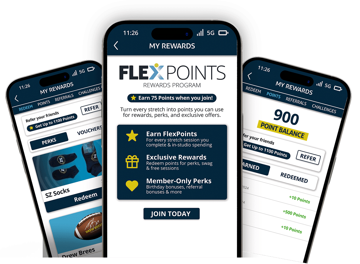 By joining our FlexPoints Reward Program, we’re extending even more reasons for you to enjoy Stretch Zone. You can earn points for each session you attend, dollar you spend, friend you refer, plus more bonus features!